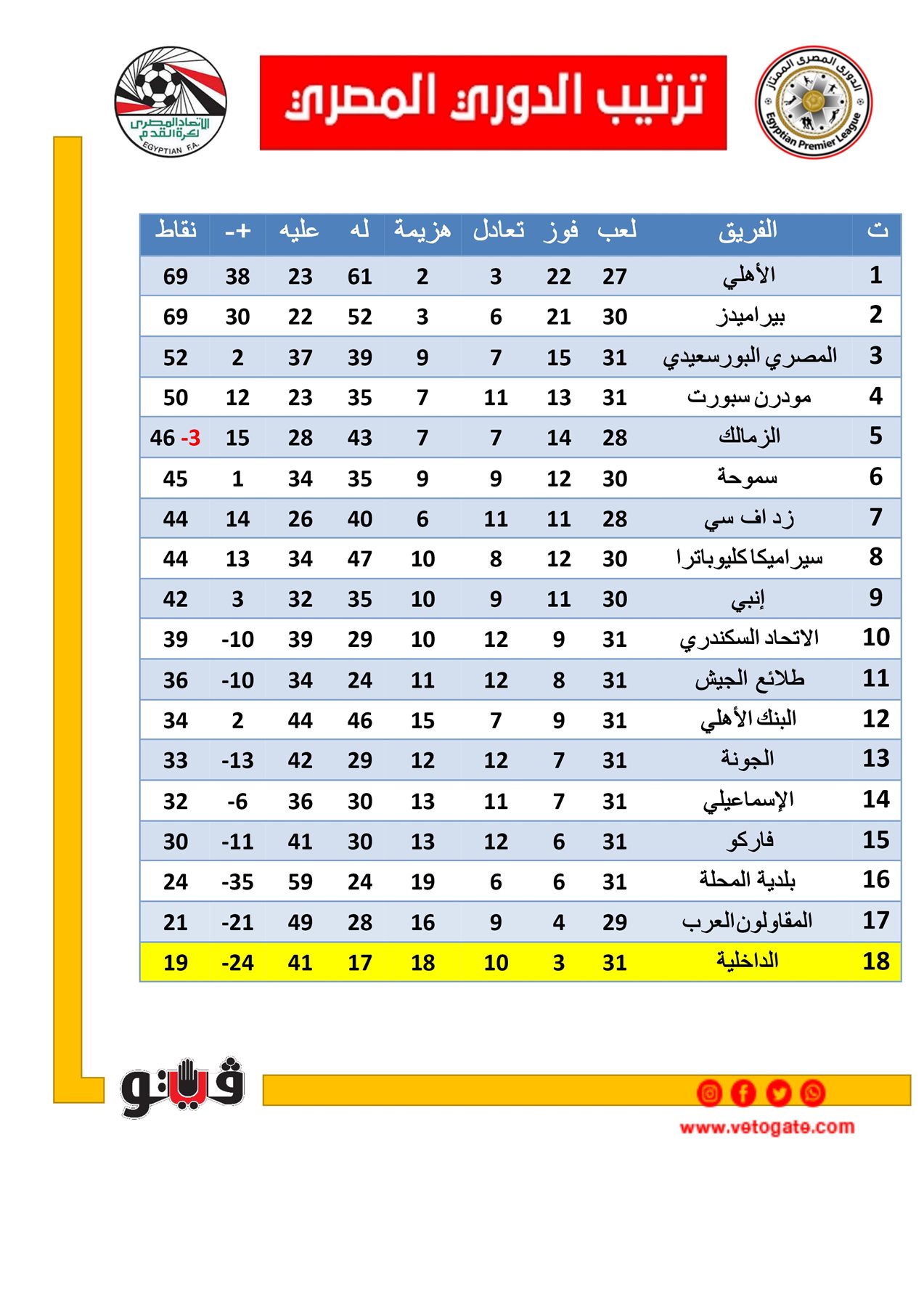 ترتيب الدوري المصري: يتصدر النادي الأهلي جدول ترتيب الدوري المصري الممتاز برصيد 69 نقطة، يليه بيراميدز في المركز الثاني، بعد فوز الأهلي على المصري وتعادل بيراميدز مع الزمالك.