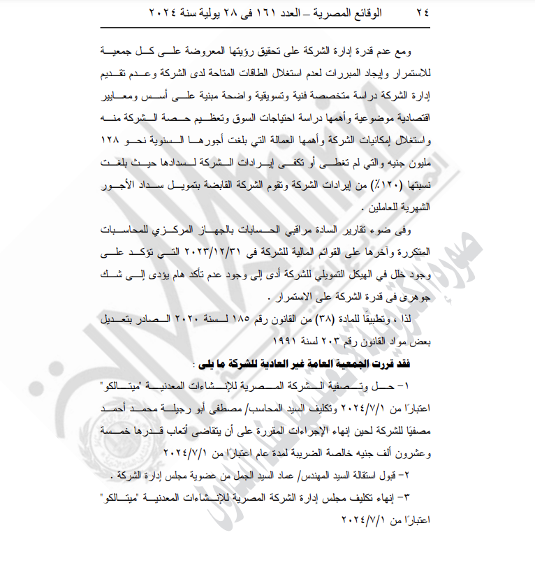 3- إنهاء تكليف مجلس إدارة الشركة المصرية للإنشاءات المعدنية “ميتالكو” اعتباراً من 1/7/2024.