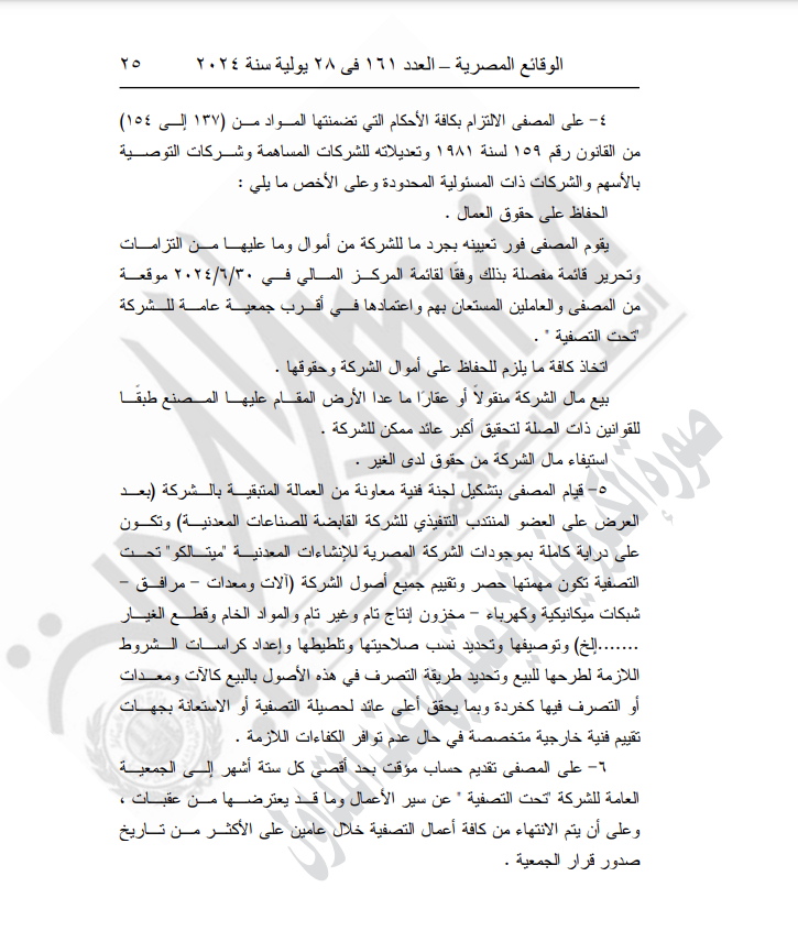 4- يجب على المصفي أن يلتزم بجميع الأحكام الواردة في المواد (137) إلى (154) من القانون رقم 159 لسنة 1981 وتعديلاته في شأن شركات المساهمة وشركات التوصية البسيطة والشركات ذات المسؤولية المحدودة وخاصة ما يلي: حفظ حقوق العمال.