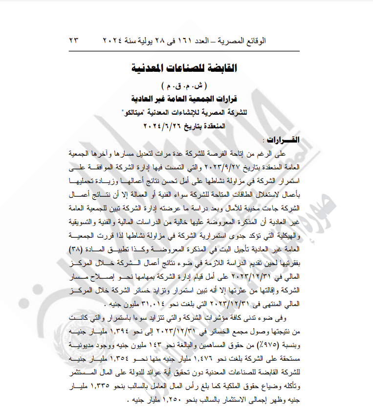 انه قادم وبعد دراسة ما عرضته إدارة الشركة تبين للجمعية العامة غير العادية أن المذكرة المعروضة عليها خالية من الدراسات المالية والفنية والتسويقية والهيكلية التي تؤكد جدوى استمرارية الشركة في نشاطها، لذا قررت الجمعية العامة غير العادية تأجيل البت في المذكرة المعروضة وكذلك تطبيق المادة 38 بفقرتيها لحين تقديم الدراسة اللازمة في ضوء نتائج أعمال الشركة خلال المركز المالي في 31/12/2023، على أمل أن تقوم إدارة الشركة بمهامها نحو إصلاح مسار الشركة وإنقاذها من التعثر، إلا أنه تبين استمرار خسائر الشركة وتزايدها خلال المركز المالي المنتهي في 31/12/2023 والتي بلغت نحو 31.014 مليون جنيه.