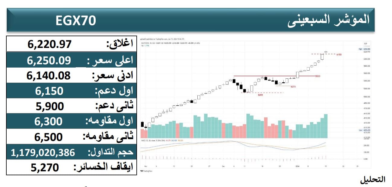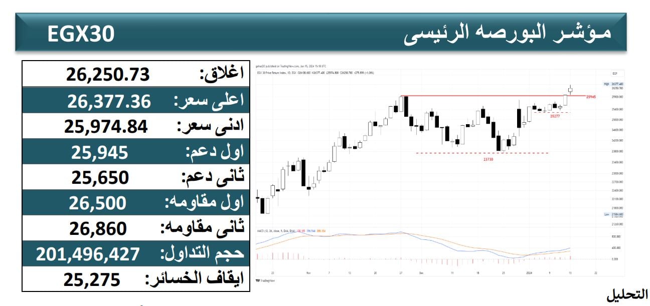 التحليل الفني لمؤشرات البورصة المصرية اليوم الأربعاء 17-1-2024 ,