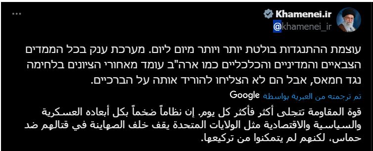 وقال خامنئي في تغريدة له: “إن قوة المقاومة تتجلى أكثر فأكثر كل يوم”، مضيفا: “إن نظاما ضخما بكل أبعاده العسكرية والسياسية والاقتصادية مثل الولايات المتحدة يقف وراء الصهاينة في حربهم ضد حماس، لكنهم لم يتمكنوا من تركيعه”.