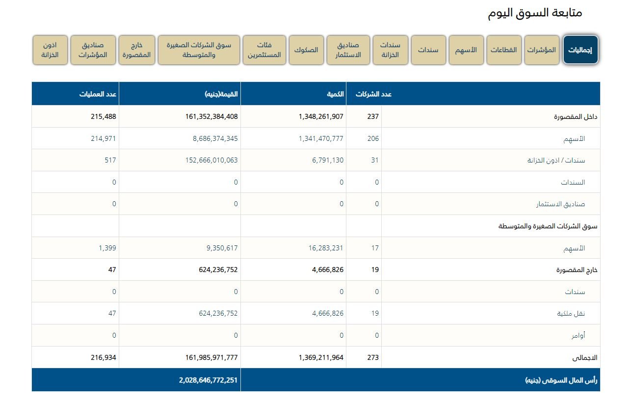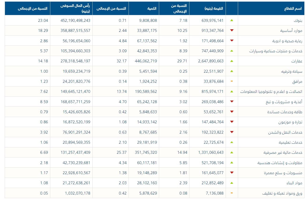 وانخفض مؤشر الأوزان المتساوية EGX70 بنسبة 3.95% ليغلق عند 7544 نقطة، كما انخفض مؤشر EGX100 للأوزان المتساوية بنسبة 3.81% ليغلق عند 10403 نقطة.