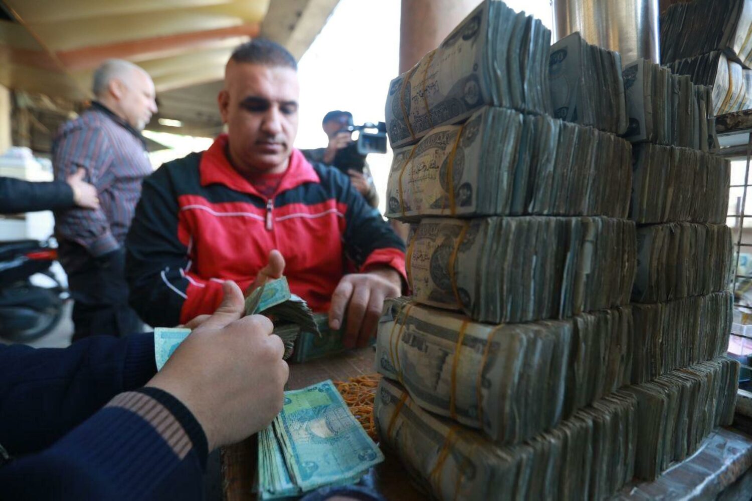 المواطنون يشترون ويصرفون العملات الأجنبية في مكاتب الصرافة بعد انخفاض سعر الصرف إثر تغيير رئيس البنك المركزي في بغداد، العراق في 25 كانون الثاني/يناير 2023. (تصوير مرتضى السوداني/غيتي)