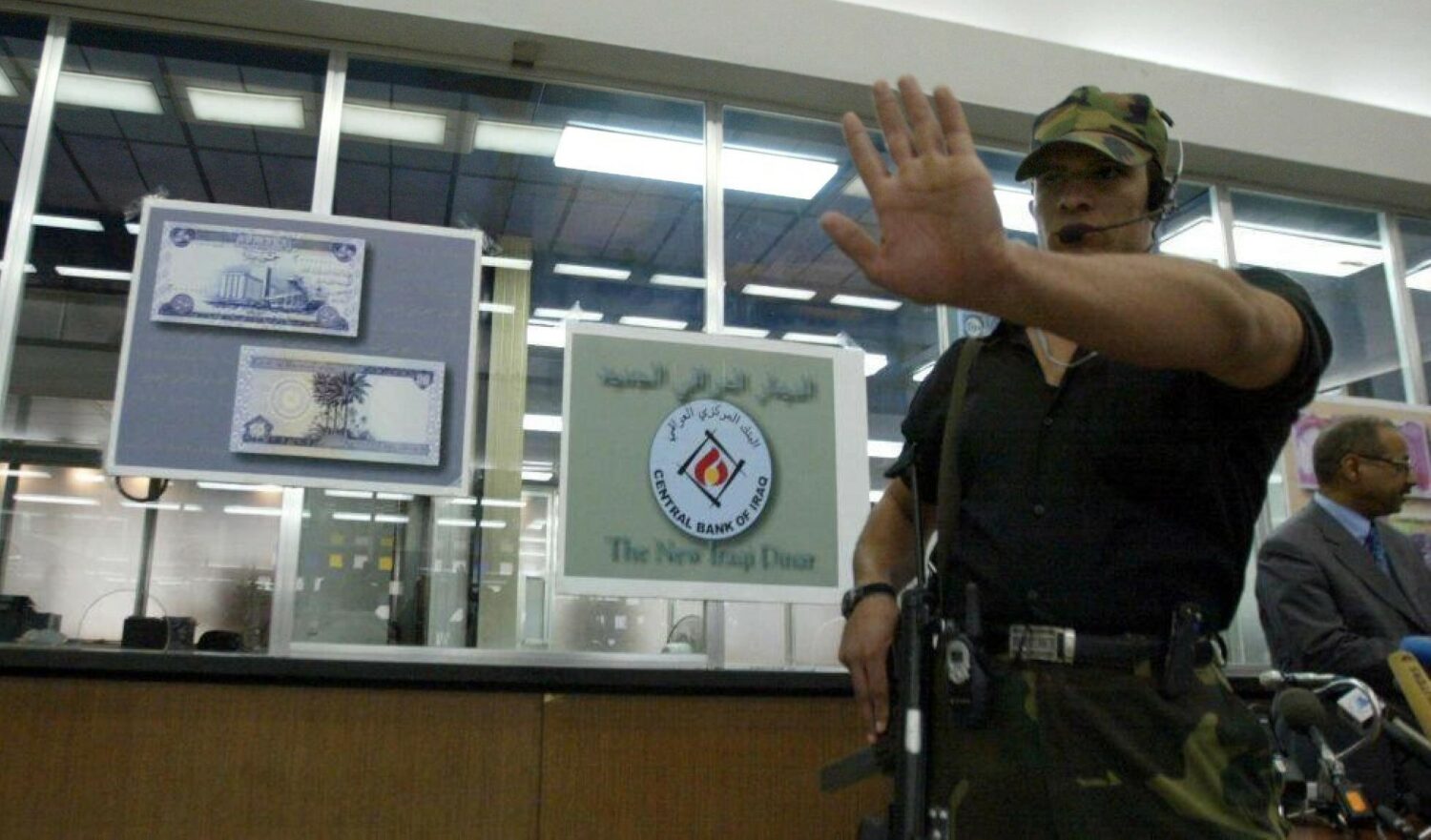 حارس شخصي عراقي من خدمة النخبة الجديدة يقف حارسًا داخل البنك المركزي في بغداد. (تصوير كريم صاحب/ وكالة الصحافة الفرنسية)