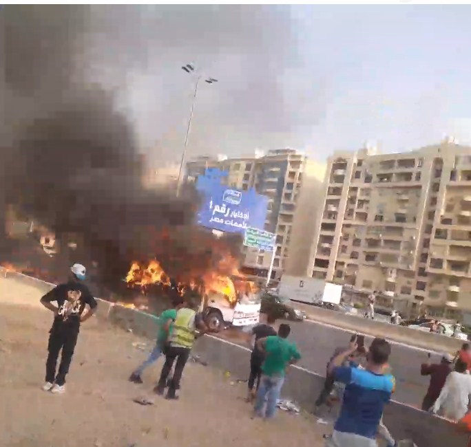 وبالانتقال والفحص تبين اشتعال النيران بسيارة نقل كبيرة محملة بأكياس القطن المشتعلة، وكانت ألسنة اللهب تتصاعد من أعلى السيارة إلى الطريق الدائري، مما أدى إلى توقف الطريق في الاتجاهين، وتمكنت فرق الإطفاء من السيطرة على الحريق.