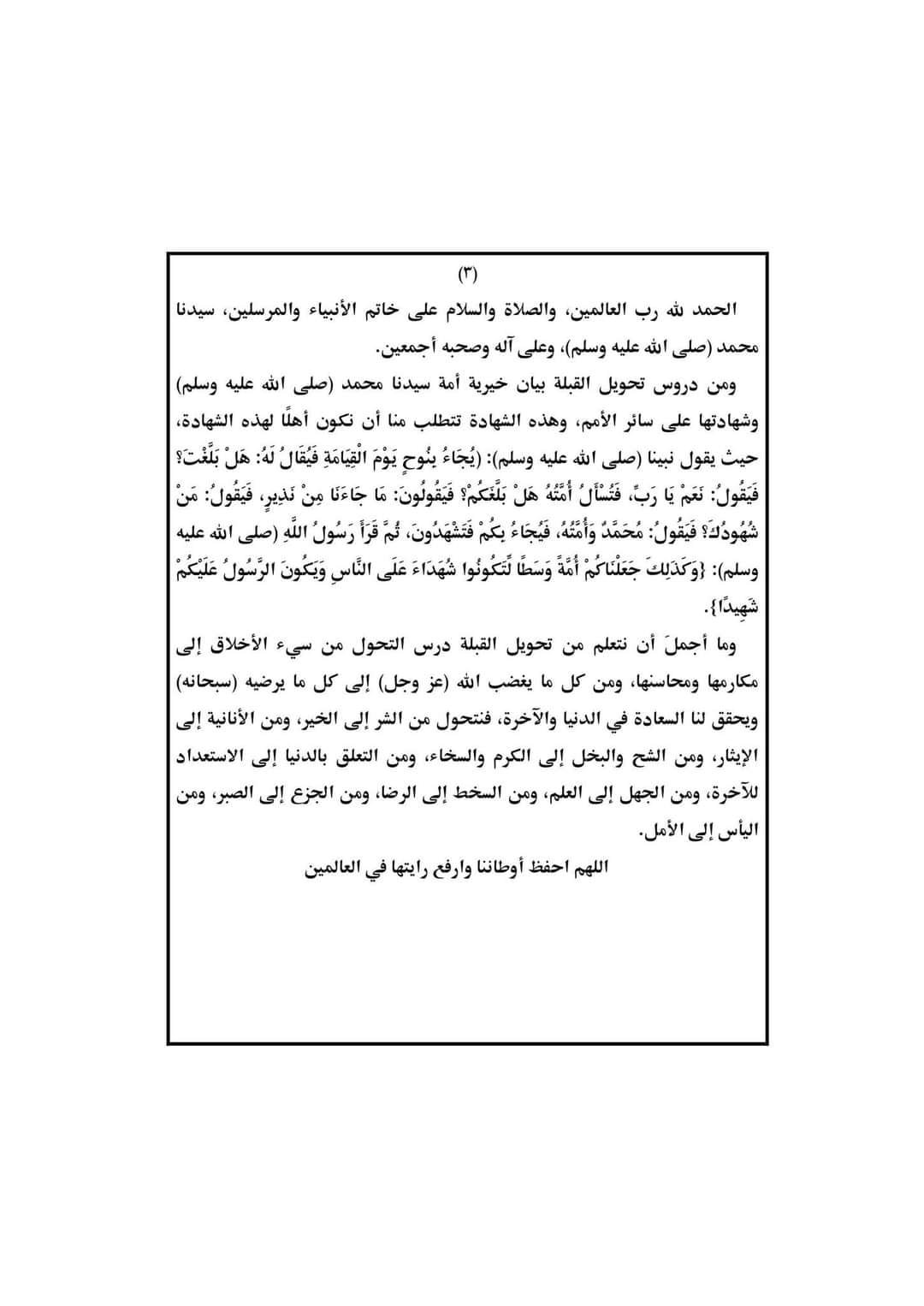 وحددت وزارة الأوقاف موضوع خطبة اليوم الجمعة بعنوان “تغيير القبلة.. دروس وعبر”، حيث كان نص الخطبة كالآتي: