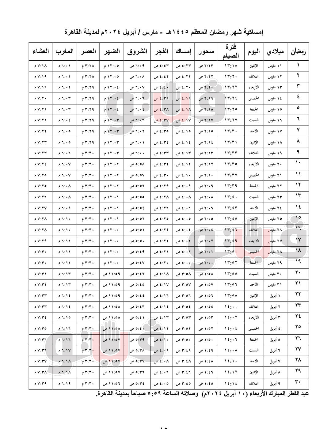 وسيكون يوم 10 أبريل أول أيام عيد الفطر، وستكون صلاة العيد الساعة 5:59 صباحا.