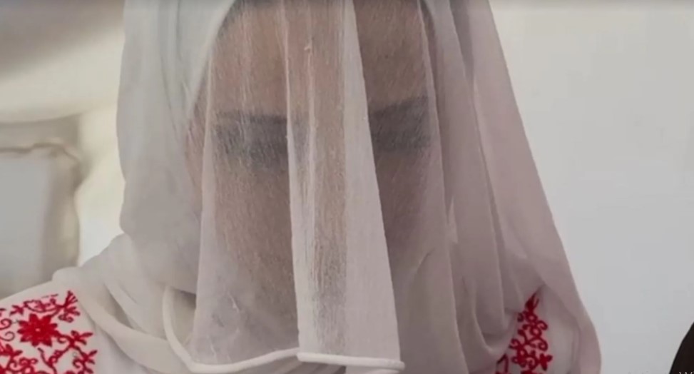 داخل الخيمة المزينة ببساطة، رفعت شهد يدها وأهداها الغندور خاتم زواج. وكانت ترتدي فستاناً أبيض اللون وحجاباً مزيناً بالتطريز الأحمر التقليدي.