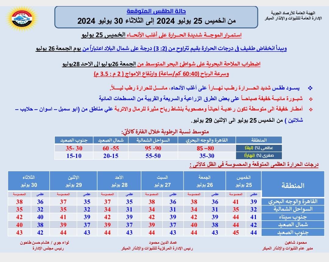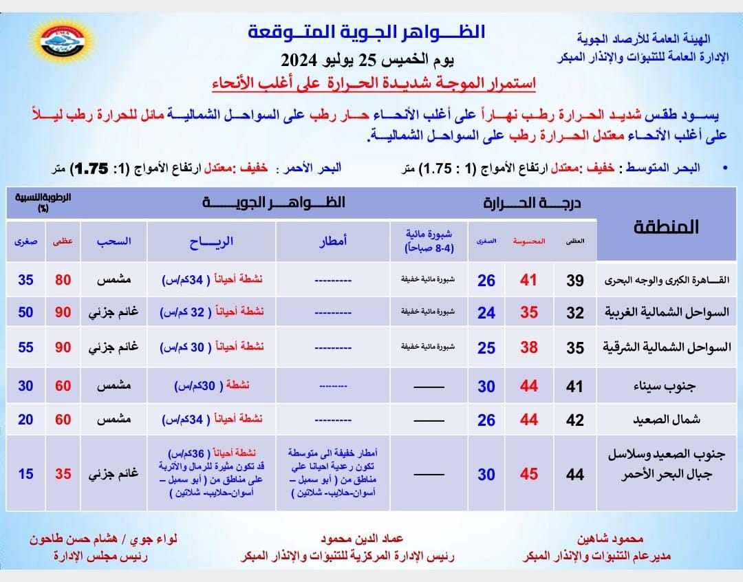 أما عن طقس اليوم الخميس، أشارت هيئة الأرصاد الجوية إلى أن الطقس اليوم سيظل شديد الحرارة ورطبًا على أغلب الأنحاء، مع توقعات بتراوح درجات الحرارة العظمى في الظل بين (38-39) درجة على القاهرة الكبرى والسواحل الشمالية ومدن القناة.