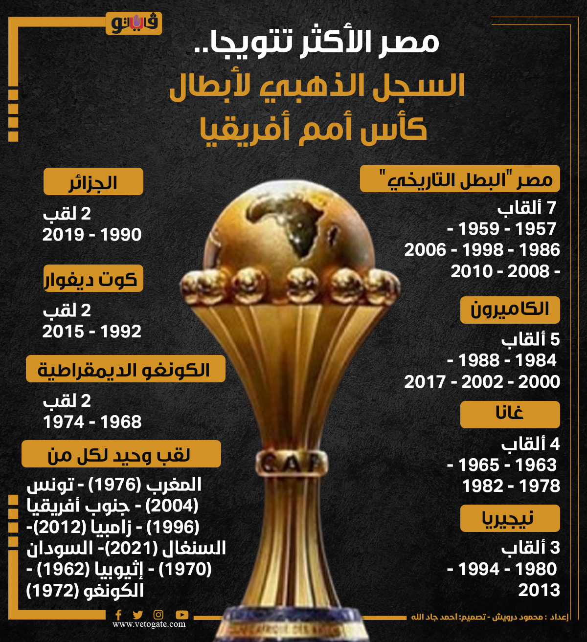 ويعد المنتخب المصري هو الأكثر تتويجا بكأس الأمم الأفريقية برصيد 7 بطولات، يليه الكاميرون في المركز الثاني. وجاءت قائمة الفرق الـ15 التي فازت ببطولة كان على النحو التالي: