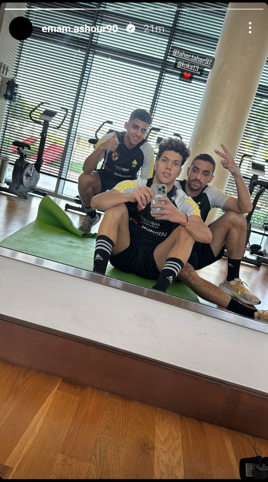 ونشر إمام عاشور عبر حسابه الشخصي على موقع التواصل الاجتماعي إنستجرام، صورة له مع طاهر وكوكا أثناء قيامهما بأداء بعض التمارين البدنية داخل صالة الألعاب الرياضية استعدادًا لمواجهة نادي المستقبل.