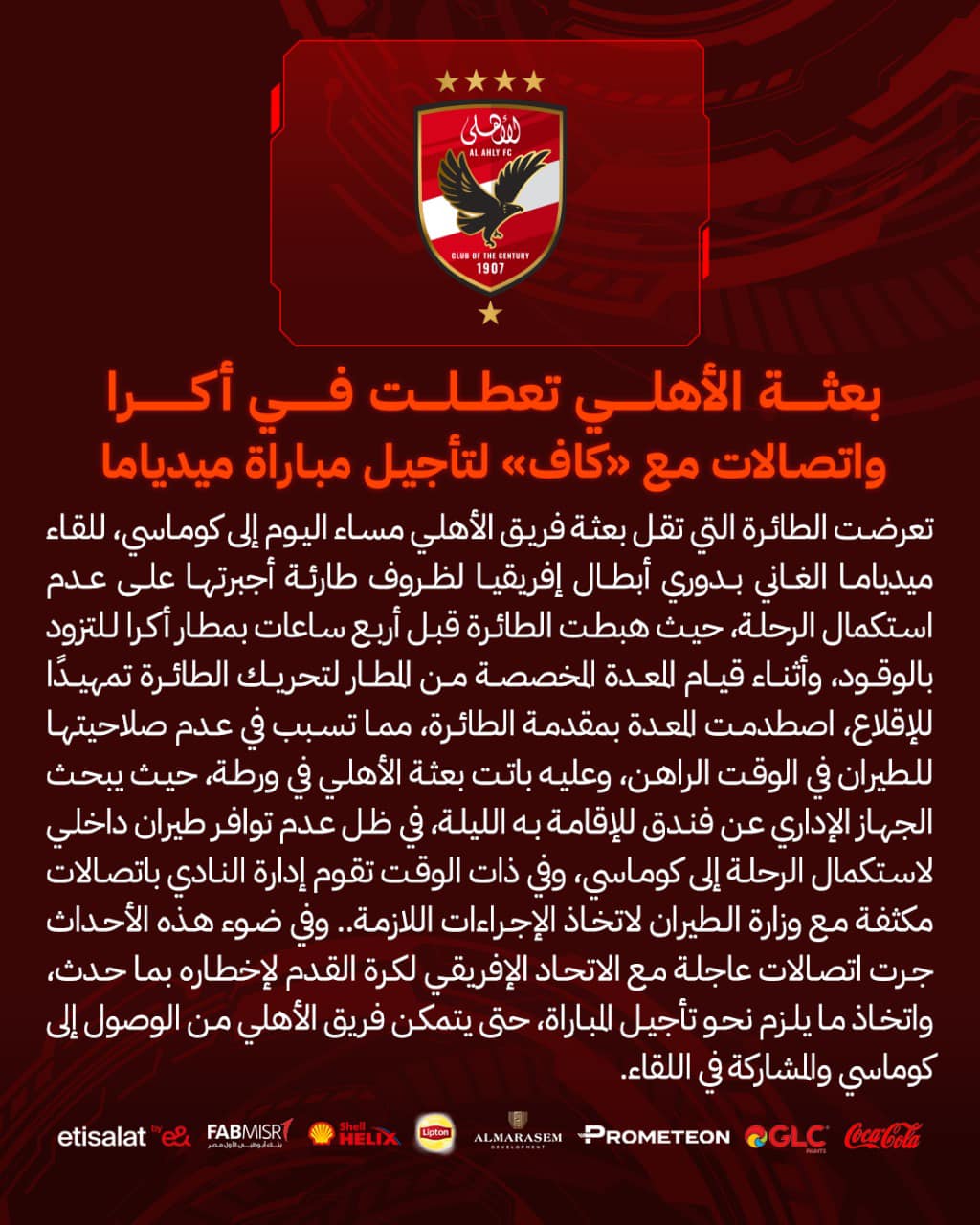وكان الأهلي قد نشر بيانا رسميا يوضح فيه ما حدث لطائرة الفريقين في مطار أكرا بغانا، وجاء كالآتي: