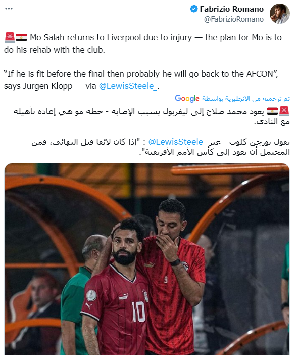 وبعد إجراء فحوصات إضافية على محمد صلاح خلال الساعات الأخيرة، وبعد التواصل بين الجهاز الطبي للمنتخب ونظيره في ليفربول، تقرر عودة اللاعب إلى إنجلترا بعد مباراة الرأس الأخضر غدا لاستكمال علاجه، مع الأمل في أن ينضم للمنتخب الوطني في نصف نهائي كأس الأمم الأفريقية في حال تأهله.