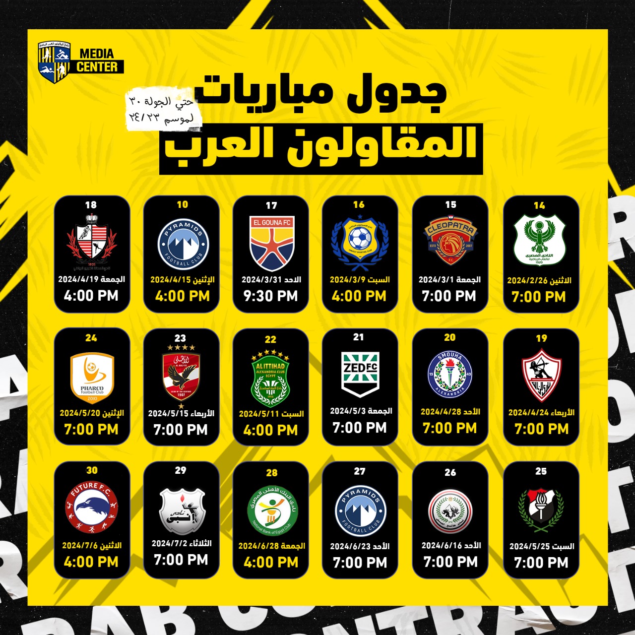 مواعيد مباريات المقاولون العرب حتى الجولة 30 بالدوري ,