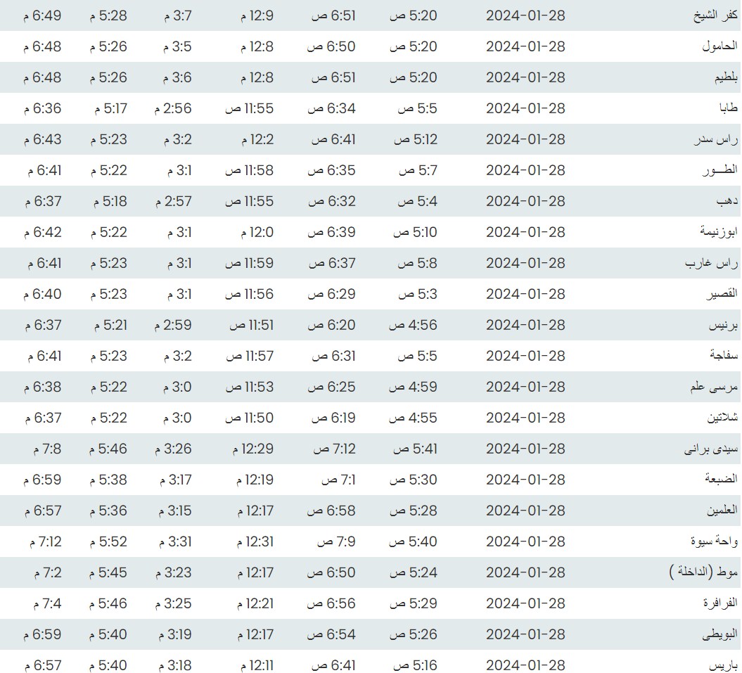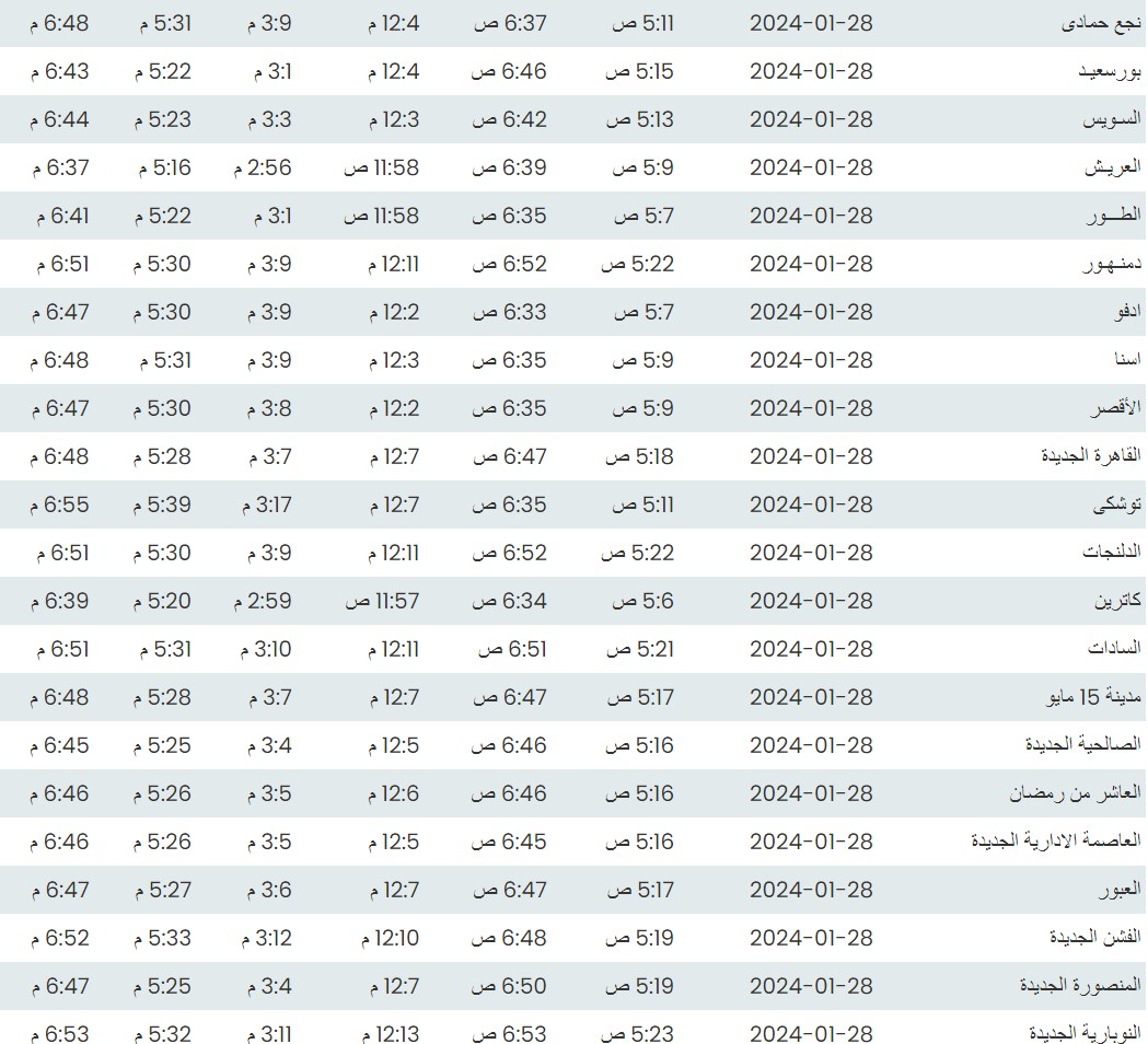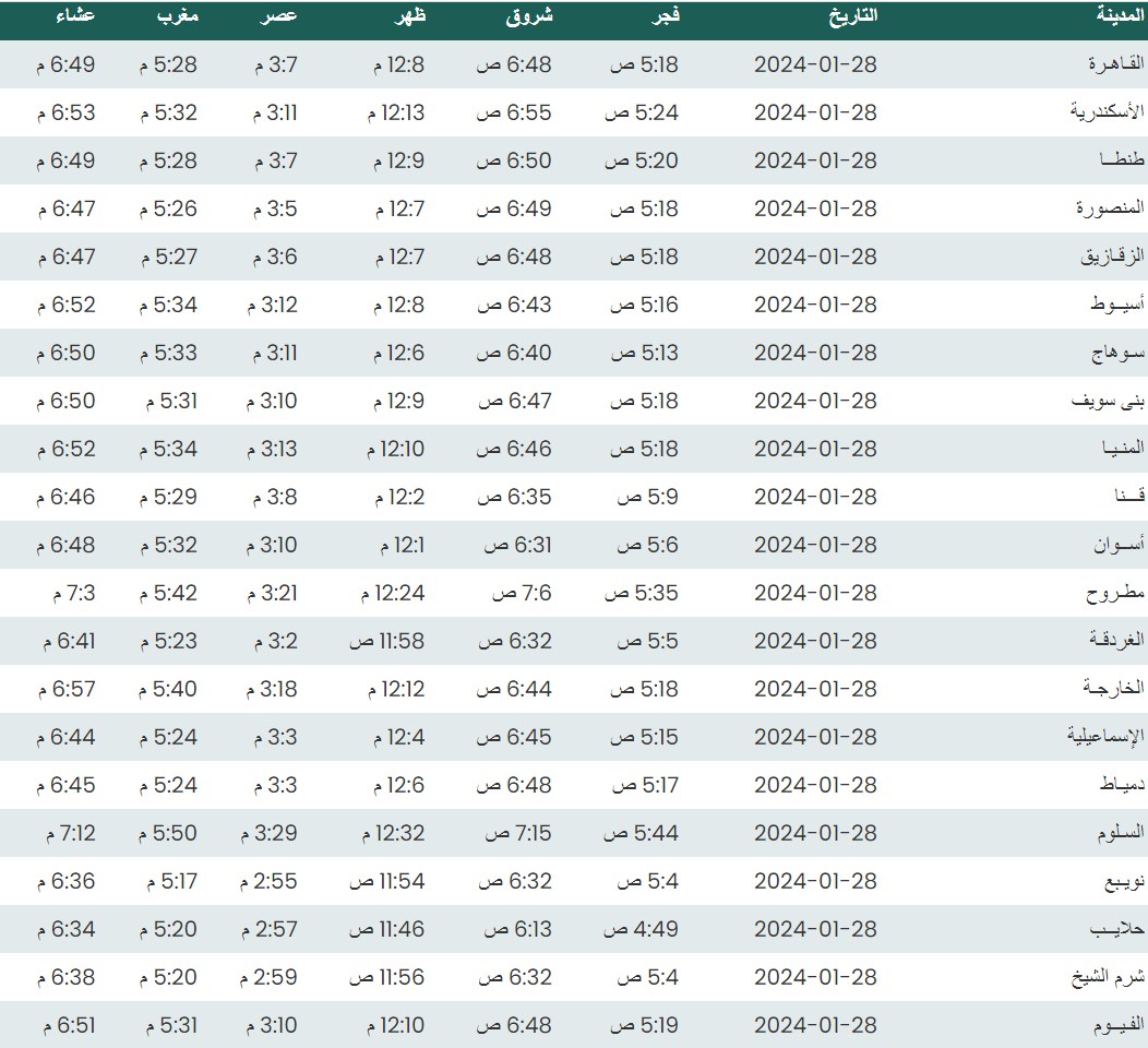 وفيما يلي أوقات الصلاة لعدد من مدن ومحافظات الجمهورية بناء على بيانات الهيئة العامة للمساحة