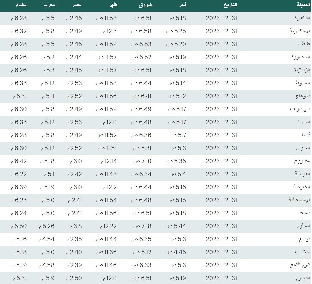 وفيما يلي أوقات الصلاة لعدد من مدن ومحافظات الجمهورية بناء على بيانات الهيئة العامة للمساحة
