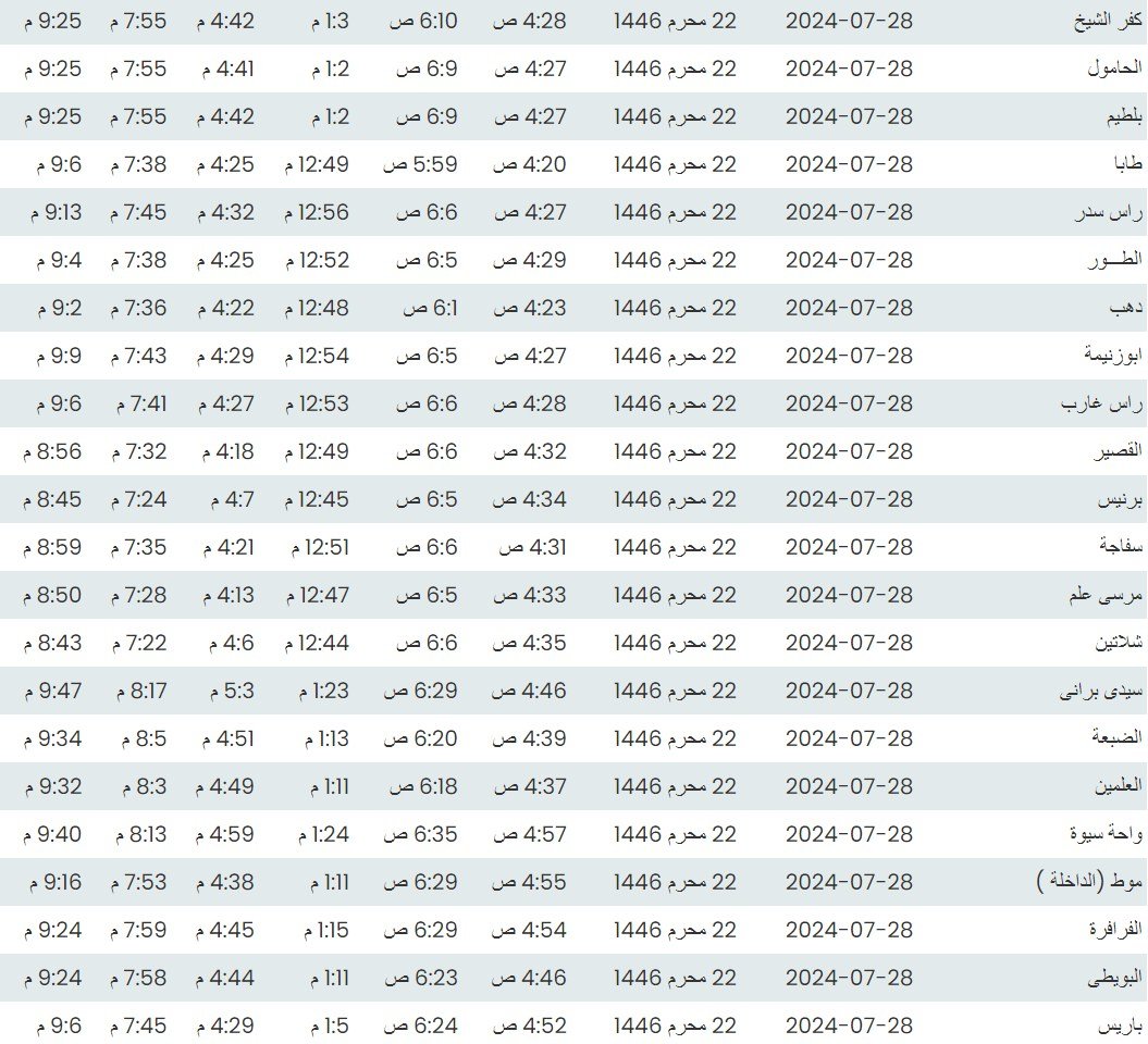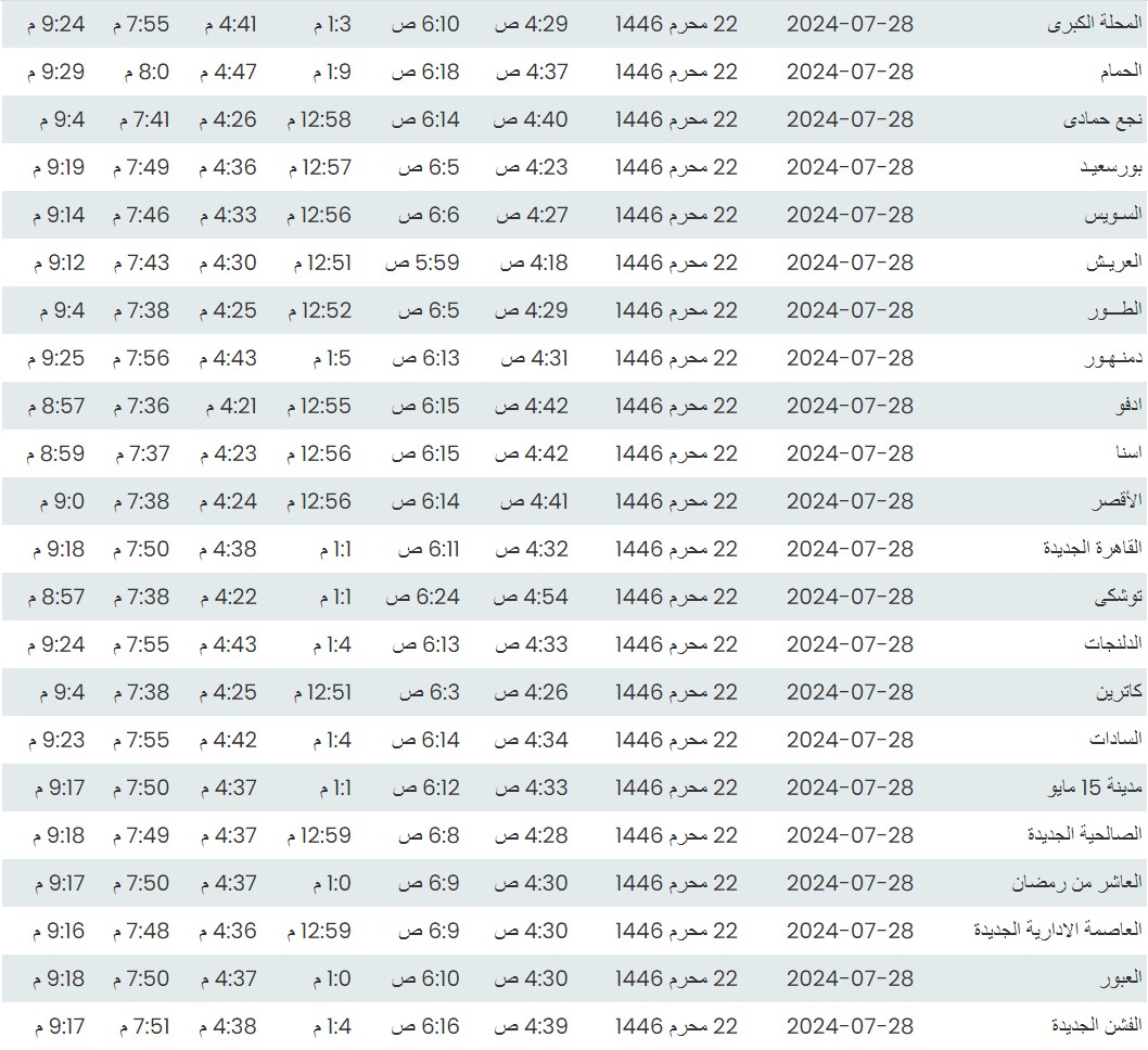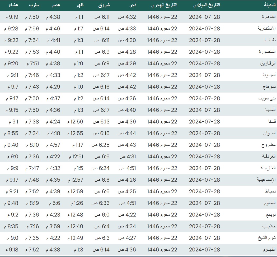 وفيما يلي مواقيت الصلاة لعدد من مدن ومحافظات الجمهورية، بناء على بيانات الهيئة العامة للمساحة.