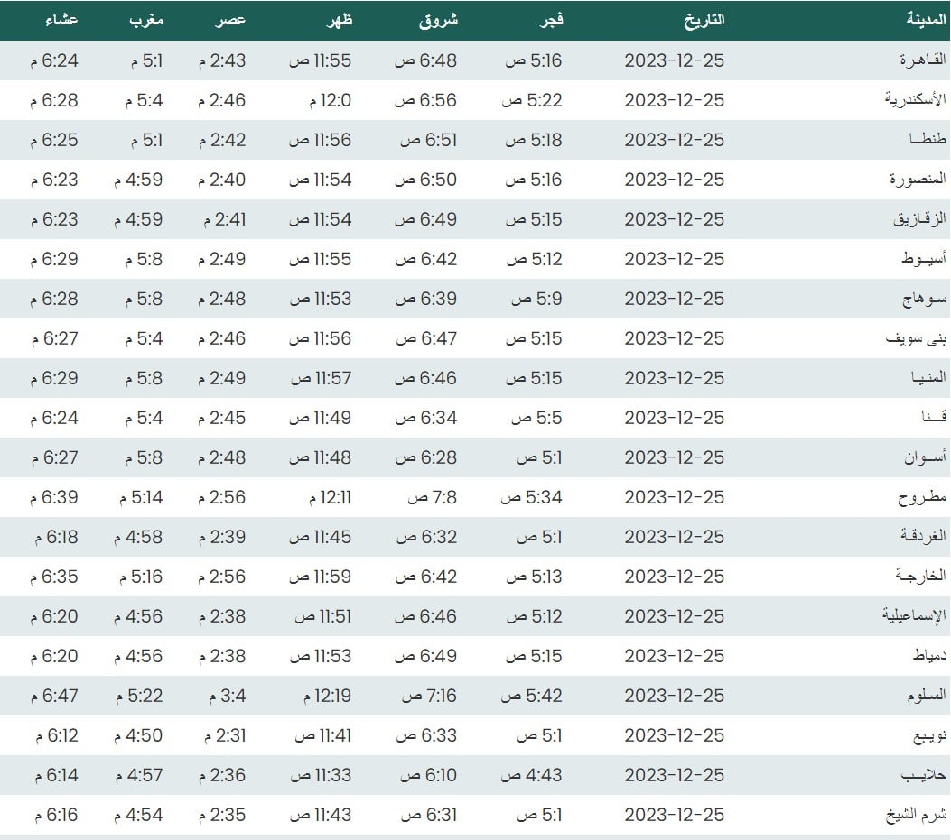 مواقيت الصلاة اليوم حسب التوقيت المحلي لمدينتي القاهرة والإسكندرية وعدد من مدن ومحافظات الجمهورية بناء على بيانات الهيئة العامة للمساحة