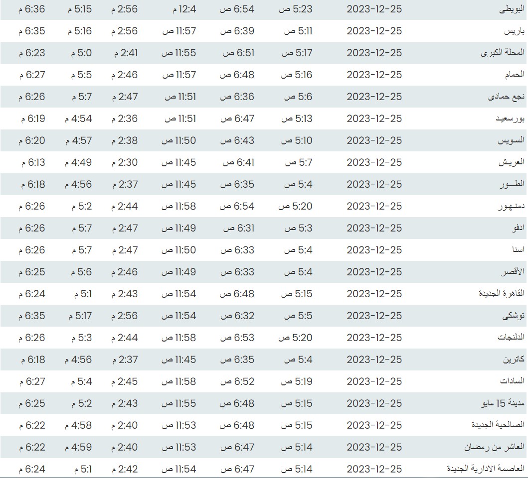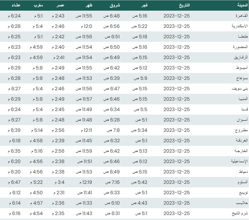 مواقيت الصلاة اليوم حسب التوقيت المحلي لمدينتي القاهرة والإسكندرية وعدد من مدن ومحافظات الجمهورية بناء على بيانات الهيئة العامة للمساحة