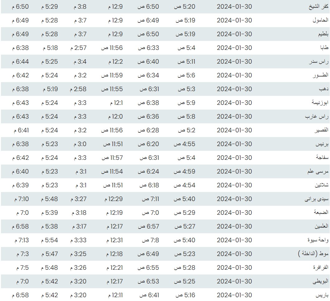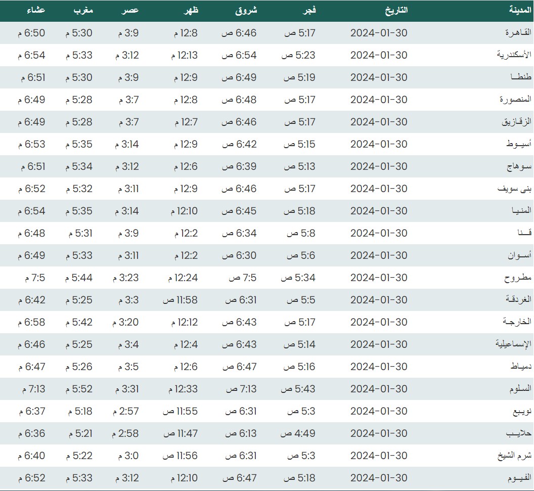 وفيما يلي أوقات الصلاة لعدد من مدن ومحافظات الجمهورية بناء على بيانات الهيئة العامة للمساحة