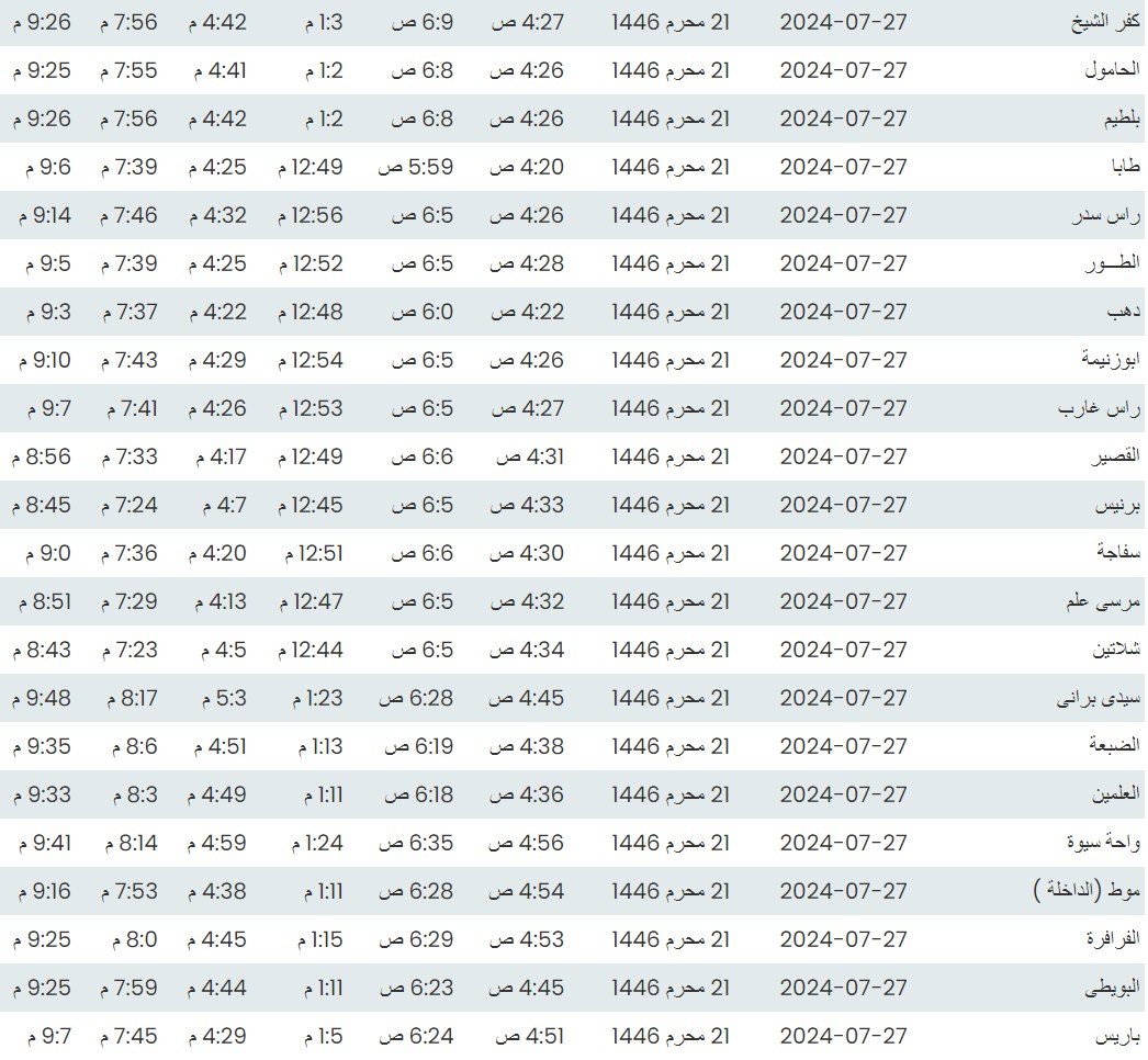 وفيما يلي مواقيت الصلاة لعدد من مدن ومحافظات الجمهورية، بناء على بيانات الهيئة العامة للمساحة.