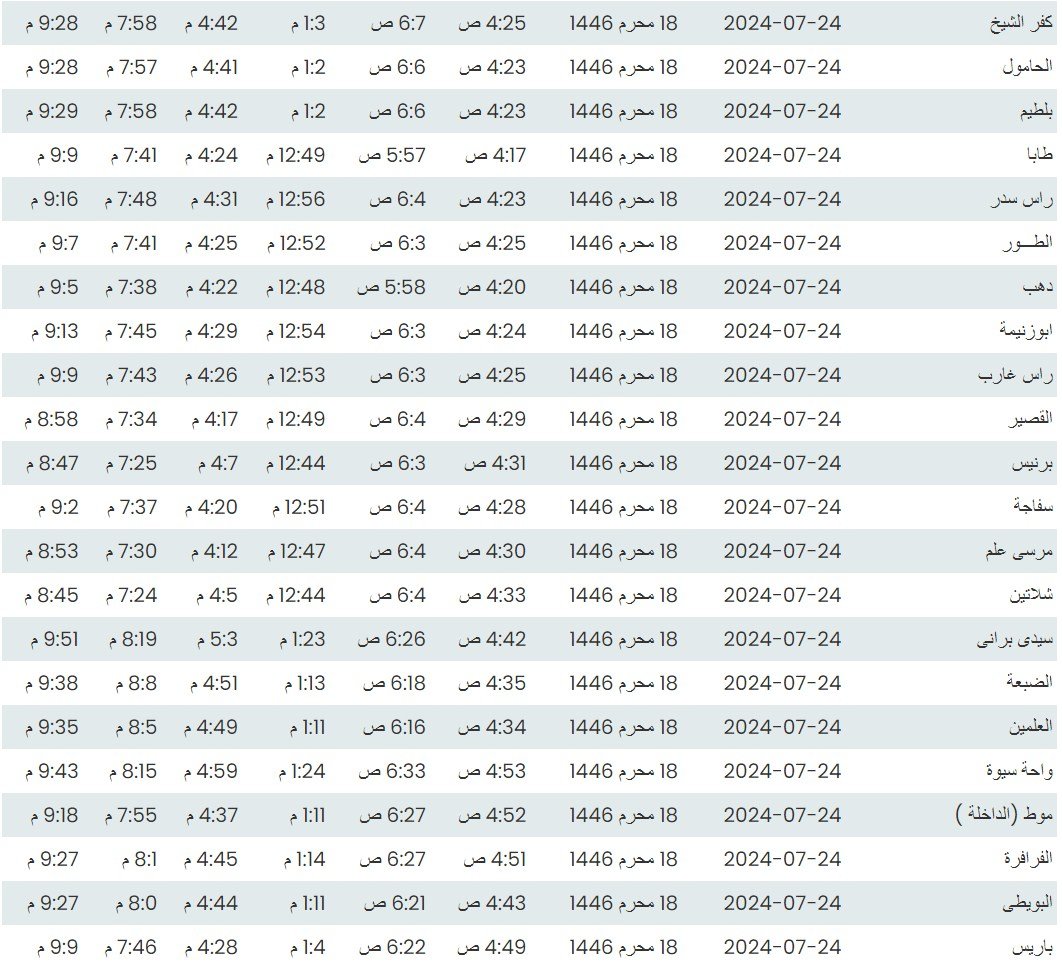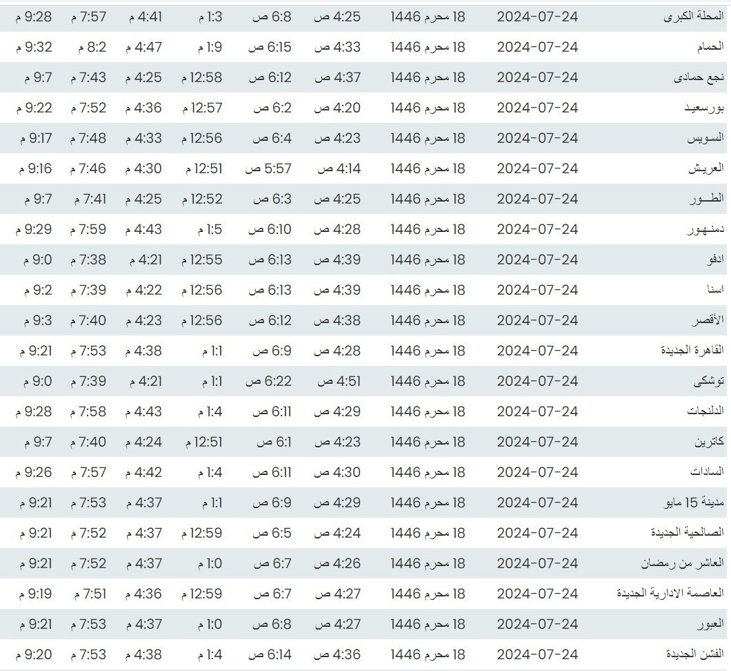 وفيما يلي مواقيت الصلاة لعدد من مدن ومحافظات الجمهورية، بناء على بيانات الهيئة العامة للمساحة.