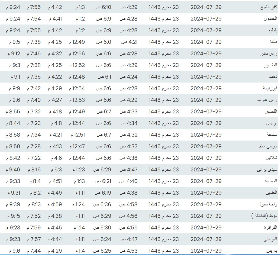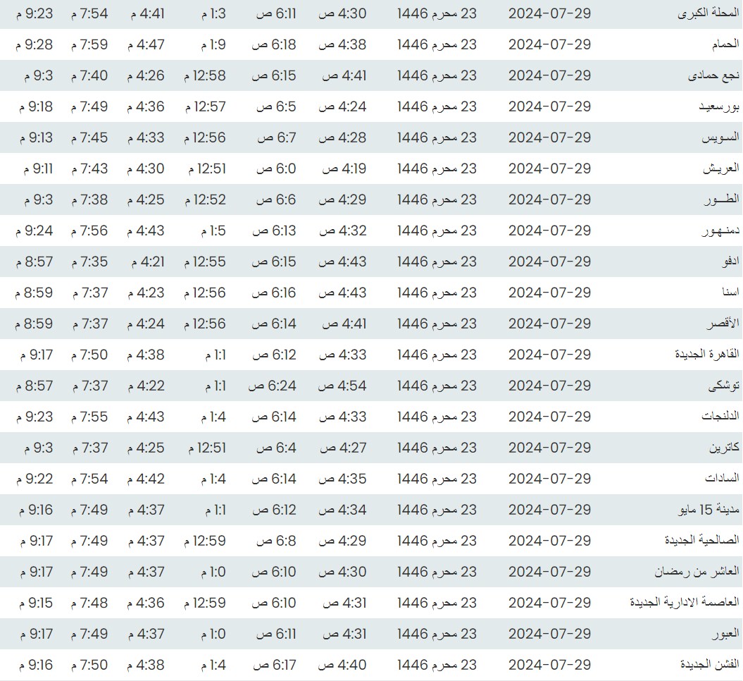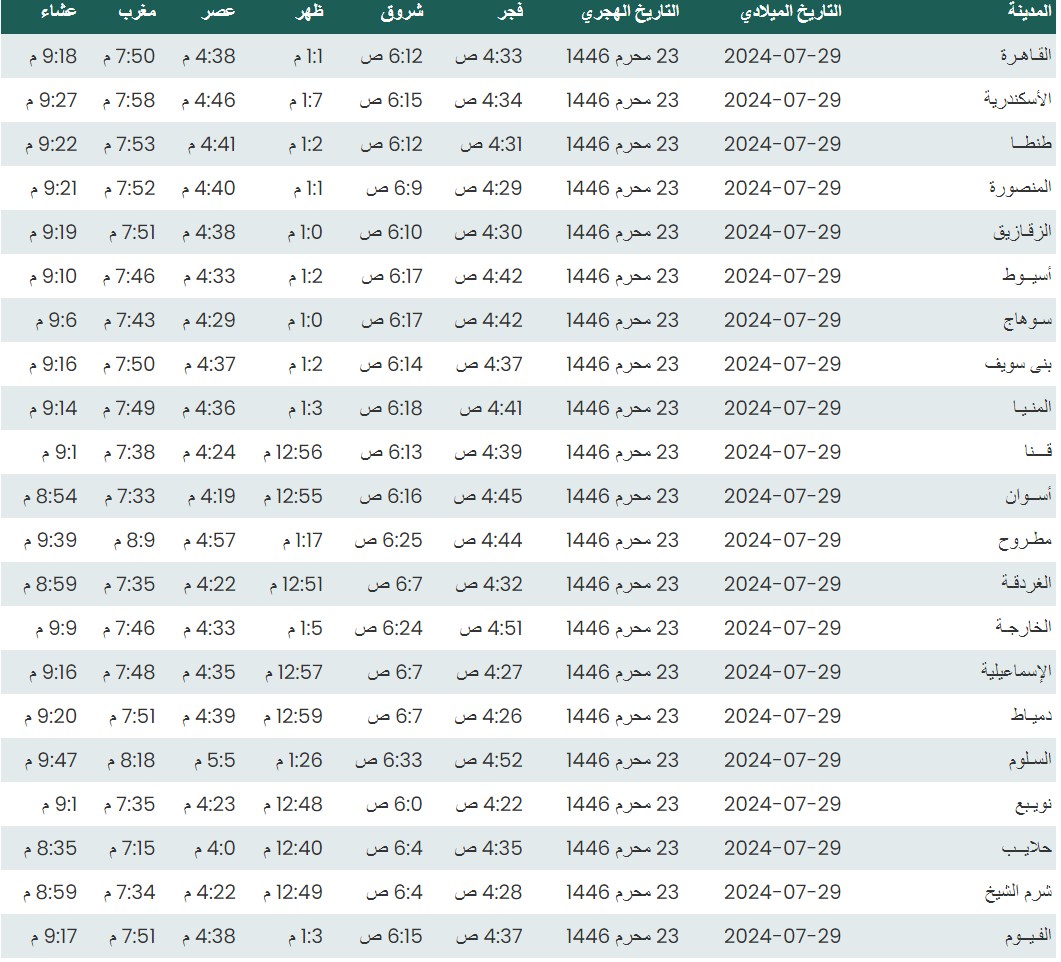 وفيما يلي مواقيت الصلاة لعدد من مدن ومحافظات الجمهورية، بناء على بيانات الهيئة العامة للمساحة.