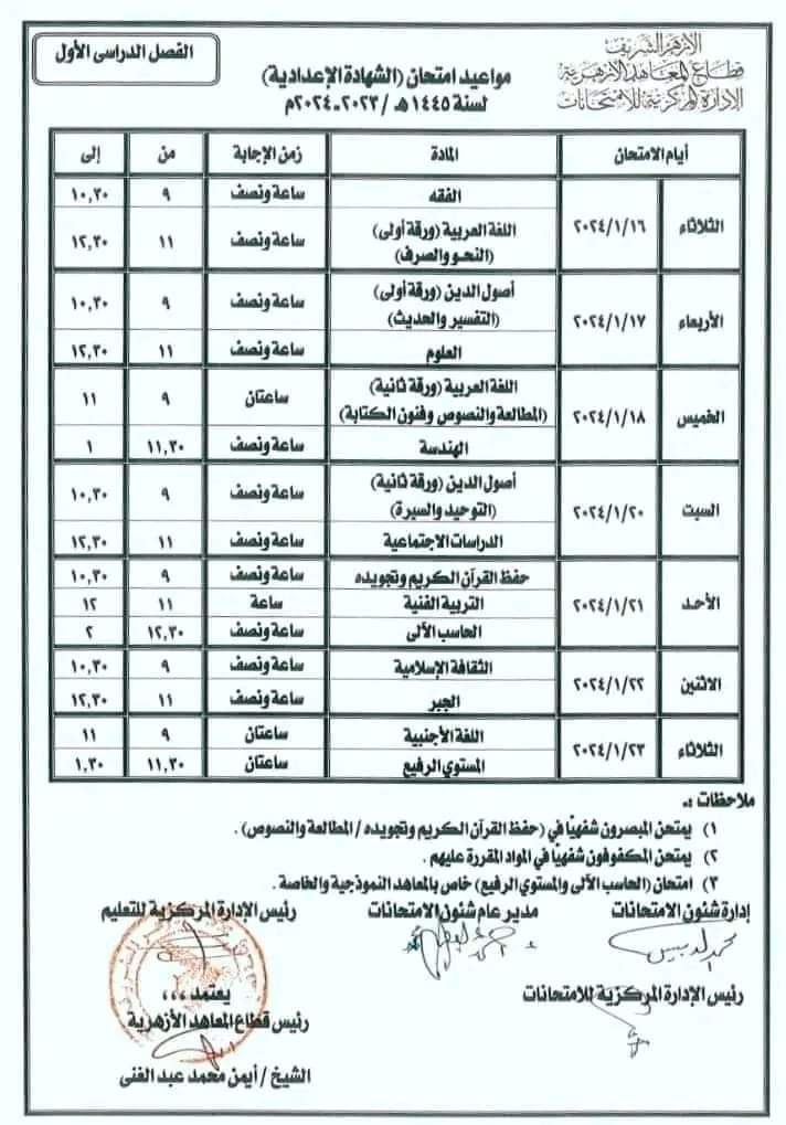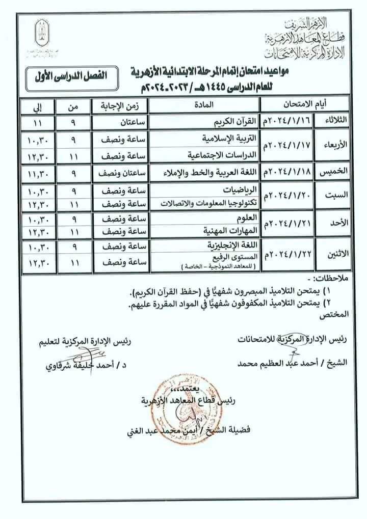 وينتهي العام الدراسي في جميع المعاهد الأزهرية بانتهاء الامتحانات للعام الجامعي 2023/2024، وتعتبر فترة امتحانات الفصلين الأول والثاني ضمن أيام الدراسة الفعلية وتحتسب ضمن نسبة الحضور.